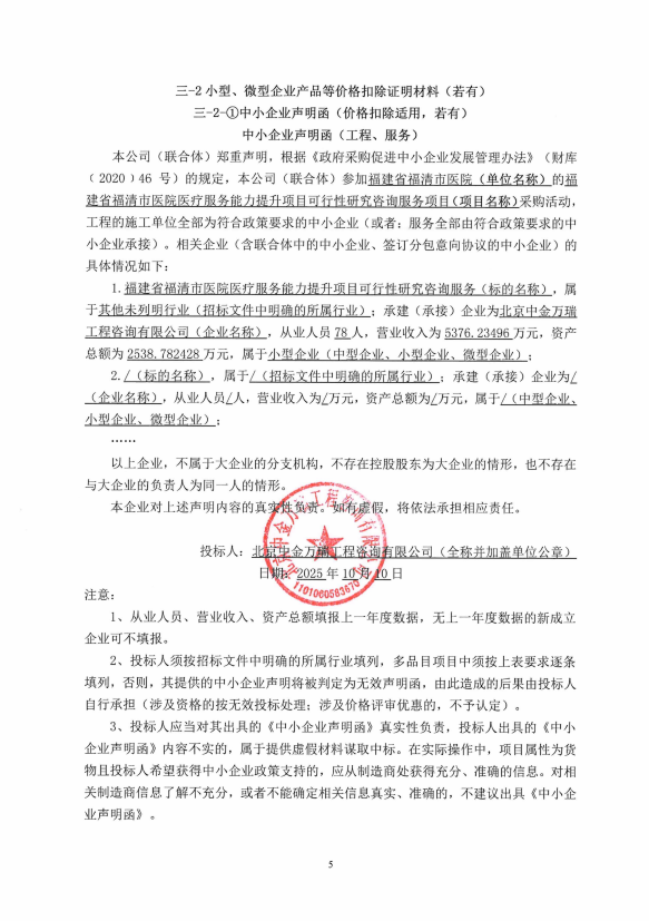 2、北京中金萬(wàn)瑞工程咨詢有限公司按邀請(qǐng)招標(biāo)文件要求提供小微企業(yè)扣除證明材料,投標(biāo)報(bào)價(jià)給予15%價(jià)格扣除,用扣除后的價(jià)格參加評(píng)審。